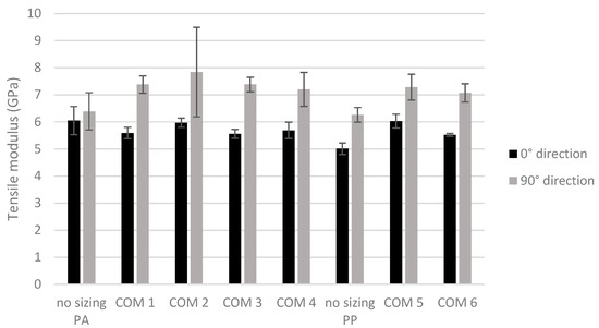Tensile modulus of carbon/PA6 and carbon/PP composites containing different fiber sizings. In black are the results obtained in the 0° direction and in gray are the results obtained in the 90° direction of the composite plate.