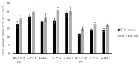 Figure 6 presents the average interlaminar shear strengths and the standard deviations. It can be seen from the graph that, in general, the ILLS value can be increased by a pretreatment step of the carbon nonwoven for both directions. Also, the ILSS values are higher for the PA6 composites than for the PP composites with and without resizing. For the PA6 composites, there is no clear effect of the film former concentration in the sizing formulation (COM 1: 22.1 MPa for 0°; 25.1 MPa for 90° vs. COM 2: 19.2 MPa for 0°; 21.5 MPa for 90° or COM 3: 19.7 MPa for 0°; 26 MPa for 90° vs. COM 4: 24.2 MPa for 0°; 25.2 MPa for 90°) on the interlaminar shear strength or adding extra additives (COM 1 vs. COM 3 and COM 2 vs. COM 4). For the PP composites, there is no difference between 5% (COM 6: 14.1 MPa for 0°; 17.0 MPa for 90°) and 10% (COM 5: 14.3 MPa for 0°; 17.8 MPa for 90°) of film former present on the carbon fiber for the interlaminar shear strength, but both treatments have a positive effect on the shear strength, as the average values of the non-sized PP composites in the 0° and 90° directions are 11.9 MPa and 14.9 MPa, respectively.