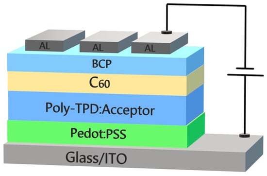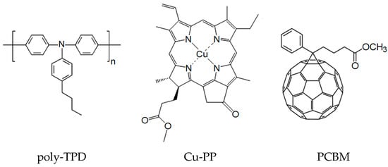 Poly[N,N′-bis(4-butylphenyl)-N,N′-bis(phenyl)-benzidine] (poly-TPD) from American Dye Source, Inc. (ADS254BE) (Baie-D’Urfe, QC, Canada), [6,6]-Phenyl-C61-butyric acid methyl ester (PCBM) from SES Research, C60 fullerene from MST (“Modern Synthesis Technology”, St. Petersburg, Russia) and bathocuproine (BCP) from Kintec (Hong Kong, China) were used as received. PEDOT:PSS (poly(3,4-ethylene-dioxythiophene):polystyrenesulfonate) from Heraeus (Clevios P VP AI 4083) (Hanau, Germany) was filtered prior to use, The ITO-coated glass (7 Ohm/□) was purchased from Kaivo (Zhuhai, Guangdong, China).