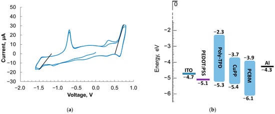 Other details of the CV were the same as described in our previous article [19]. The obtained values of the HOMO and LUMO energy levels for Cu-PP as well as for poly-TPD and PCBM [14] are shown in Figure 2b.