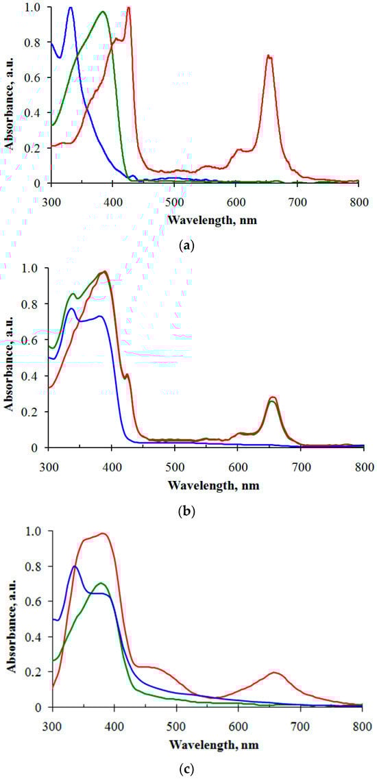 Cyclic voltammetry (CV) measurements were performed for calculation of the lowest unoccupied molecular orbital (LUMO) and HOMO energy levels. The CV experiment was carried out at the scan rate of 20 mV/s in a three-electrode, three-compartment electrochemical cell in the glove box with dry argon atmosphere. Platinum sheets served as working and counter electrodes. A 0.2 M solution of tetrabutylammonium hexafluorophosphate (NBu4PF6, Fluka) (Pittsburgh, PA, USA) in acetonitrile (ACN) was used as an electrolyte. An Ag wire immersed into the electrolyte solution with the addition of 0.1 M AgNO3 was used as a pseudo reference electrode (Ag/Ag+). It was calibrated against ferrocene/ferricenium couple (−0.039 V vs. Ag/Ag+) and its potential was recalculated to the energy scale using −4.988 eV value for Fc/Fc+ in ACN. Thus, the energy level of Ag/Ag+ is as Eref = −5.03 eV. The values of potentials corresponding to the HOMO and LUMO levels were determined by applying a tangent to the onset of anodic and cathodic currents (Figure 2a), with EHOMO = Eref − Ea (typically, Ea > 0), ELUMO = Eref − Ec (typically, Ec < 0).