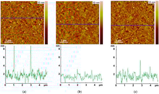 AFM images of the surface topography and sections corresponding to marked lines for (a) poly-TPD:PCBM, (b) poly-TPD:Cu-PP, and (c) poly-TPD:PCBM:Cu-PP composite films.