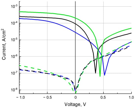 The measurements of the J–V characteristics for ITO/PEDOT:PSS/composite/C60/BCP/Al diode devices (Figure 3) were carried out in the dark and under illumination with white light from a Xe lamp and at a wavelength of 650 nm at the Cu-PP absorption maximum. Presented in Figure 6 and Figure 7, J–V curves are typical characteristics of a photodiode. Under white light illumination (Figure 6) at a reverse bias of 1 V, the ratio of photo-to-dark current was about 1100, 1300, and 1500 for poly-TPD:Cu-PP (blue curves), poly-TPD:PCBM (black curves), and poly-TPD:PCBM:Cu-PP (green curves) based devices, respectively. Under illumination at a wavelength of 650 nm, (Figure 7), the ratio of photo-to-dark current was between 30 and 50 for Cu-PP-containing devices whereas the photocurrent was negligible in Cu-PP-free devices.