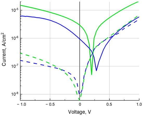J–V curves of the dark current (dashed line) and photocurrent (solid line) under illumination at a wavelength of 650 nm (a power of 3 mW × cm−2) for poly-TPD:Cu-PP- (blue) and poly-TPD:PCBM:Cu-PP- (green) based devices.