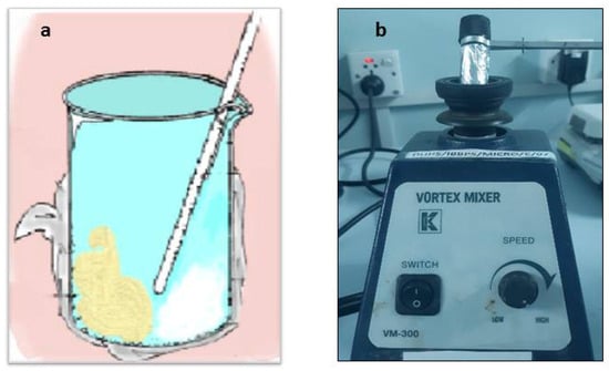 A total of four experimental groups were prepared by blending 2% and 4% by wt of CPC (Sigma Aldrich, St. Louis, MO, USA) into two RBDCs, microhybrid Filtek Z250 universal restorative (3M ESPE, St. Paul, MN, USA) and Filtek Z350 XT flowable restorative (3M ESPE, St. Paul, MN, USA). The compositions of both RBDCs are given in Table 1. The RBDC and CPC powders were weighed using analytical balance (Mettler Toledo AL204, Mississauga, ON, Canada, accuracy 0.1 mg) and mixed in a 50 mL beaker by manual spatulation in a dark room under a controlled environment (23 ± 1 °C and 55% humidity) by stirring with a glass rod vigorously for about 1 min to produce a cohesive RBDC paste (Figure 2a). Moreover, the laboratory vortex mixer (Gemmy vortex mixer; VM-300, Taipei, Taiwan) was also used to thoroughly mix the RBDCs for another 1 min at a speed of 3150 rpm in a 5 mL scintillation vial (Figure 2b). The glass vials and beaker were both coated with aluminum foil to offer shielding from ambient light. In addition, two groups of specimens from the same commercial RBDCs without the addition of CPC were used as comparative controls.