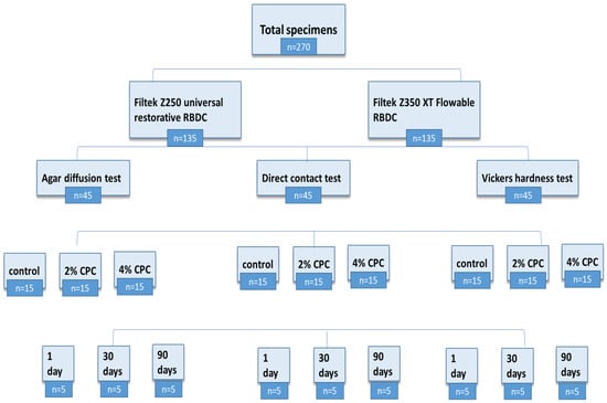 A total of two hundred and seventy (n = 270) (Figure 3) specimens were prepared using circular brass molds (2 mm thickness × 6 mm diameter) [41]. The mold was set on top of a 50 µm thick mylar strip that was laid out on a glass slab in accordance with the ISO standard 4049 [42]. Using a sterile stainless steel spatula, the RBDC material was slightly overfilled into the mold. Another piece of mylar strip was used to cover the mold to avoid the entrapment of an oxygen layer in the material bulk [43]. The excess material was squeezed out completely by applying pressure with another glass slab. Photopolymerization was carried out using LED curing light (Starlight pro Mectron, Italy, intensity 1400 mW/cm2, optical wavelength 440–480 nm) from the top surface for 40 s [39]. The tip of the light curing device had a diameter of 10 mm. The specimens were polished manually with abrasive paper sequentially to increase grain size (300–1200 grit SiC). All test specimens were stored in sterile Eppendorf tubes filled with distilled water and were placed for 1 day (n = 90), 30 days (n = 90), and 90 days (n = 90) in an incubator (Esco IFA-54-8, Singapore) at 37 °C. Moreover, the distilled water of each specimen group was replaced every 24 h in order to prevent the accumulation of leached RBDC content in the Eppendorf tubes [44].