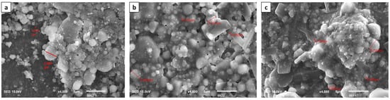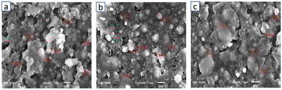 The surface morphology/structure of the Z250 universal RBDC of the control, 2%wt, and 4%wt is shown in Figure 4. The surfaces of all specimens were smooth and free of cracks. Massive agglomerates of particles of different sizes were seen in all images. The particle sizes of glass fillers varied from a much smaller 0.022 µm to a much larger 1.199 µm (Figure 4a). The addition of CPC into the universal RBDC led to a somewhat similar morphology and structure as compared to the control. A uniform distribution of particles could be seen. The structure of CPC was not clearly visible in both experimental universal RBDCs. However, a few pores were seen in the structure of the experimental RBDC with sizes ranging from (0.045–0.091 µm) (Figure 4b,c).