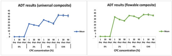 Mean Vickers hardness number for universal and flowable RBDCs for comparison with concentrations of CPC at different times.