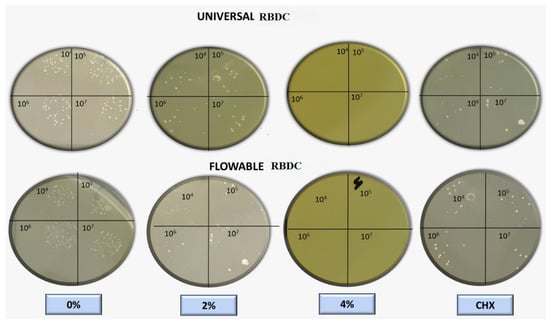 Macroscopic observation of colony-forming units for universal and flowable RBDCs on direct contact test against Streptococcus mutans.