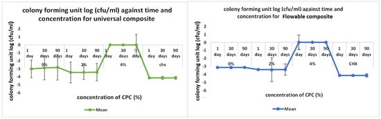 Mean colony-forming unit count for universal and flowable RBDCs for comparison with different storage times at different concentrations of CPC.