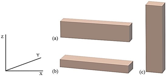 Print orientation view, in order: (a) edge (Y), (b) horizontal (X), (c) vertical (Z).