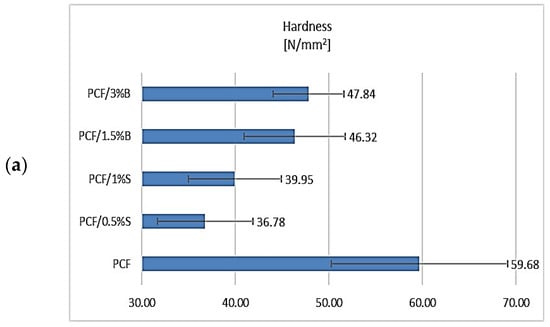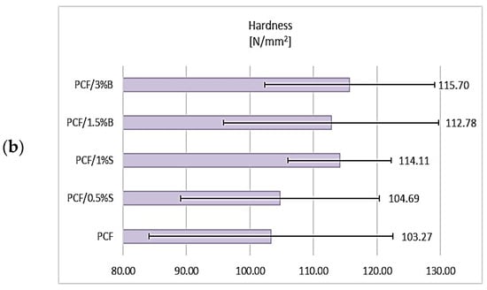 In the next stage of work, PCF and composites based on it were tested for hardness, and the results are presented in Figure 5. The obtained results of the hardness of shapes made using the additive manufacturing technique (Figure 5a) allowed for concluding that the introduced fillers had a negative impact on the hardness of the obtained composites. The lowest result was obtained for the PCF/0.5%S composite, exactly 22.90 units lower compared to the polymer. Better results were obtained when using higher concentrations of 1%S and 3%B fillers. Comparing the results obtained with those presented in Figure 5b, it was noticed that the introduced fillers increased the hardness of the shapes obtained by injection molding, regardless of the additive concentration. Higher hardness was obtained for the composites compared to the unfilled polymer. The highest result was obtained for the composite containing 3%B (115.70 N/mm2).