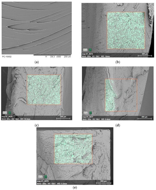 Based on SEM micrographs of brittle fractures of the tested PCF-based composites, it was observed that the brittle fracture of PCF presents a smooth surface (Figure 6a). The introduction of fillers S and B resulted in the formation of more torn plates; it is difficult to distinguish the phases present (polymer/filler); therefore, the EDS system was used (Figure 6b–e), which allows determining the elemental composition of the composite surface layer and dispersing the filler. The element silicon was selected for SEM/EDS analysis because all selected fillers contain it in their chemical structure. The selected research area is marked in red. The analysis of the examined area showed adequate dispersion of the introduced modified fillers, and moreover, no clusters or agglomerates of additives were observed. Similar regularities can be seen in the results of B. Pilica et al. [68], which indicates that the presence of a small amount of about 1% by weight of silica in the polymer is characterized by good and uniform dispersion. However, the confirmation of appropriate dispersion for composites filled with bentonite in an amount of up to 3% by weight was found elsewhere [69]. The observations confirm well-selected conditions for the homogenization of the ingredients.