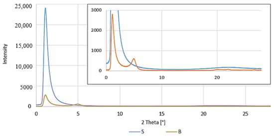 The possible range of the scattering angle of the tested materials was from 0° to 28°; therefore, only peaks were observed in the curves for one filler-modified bentonite, B (Figure 9). Under these conditions, it was not possible to observe modified silica, S, although its presence in this range was noticed in 2D-WAXS images (Figure 10a), but the obtained intensity was too low to register the scattering angle.