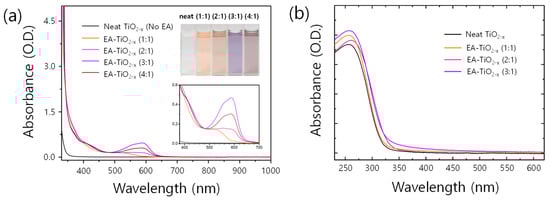 Figure 1 shows different absorption spectra changed upon mole ratios of EA to TTIP. As EA increases, new peaks at around 400 nm and 550 nm occur, accounting for the color change of precursor solutions (see inset of Figure 1). There are a myriad of works on the nitrogen doping of titanium oxides in photocatalysis studies [25,26,27,28], and similar changes in spectra upon nitrogen doping are found, where new absorptions occur at around 400 and 550 nm, irrespective of doping methods with dry gases or wet chemicals [28,29]. Despite the difference in synthesis methods of nitrogen-doped titanium oxides, similar spectrum changes found in the previous works and our EA- precursor solutions may imply that the underlying physics can be commonly shared. In previous studies [25,26,30,31,32], researchers revealed that the origin of the color changes in nitrogen-doped titanium oxides are caused by the alteration of the oxidation states of titanium core ion, in turn forming new donor states in the resulting nitrogen-doped titanium oxides. Recently, Valentin and co-workers proposed theoretical models for nitrogen-doped titanium oxides by density functional theory calculations compared with experimental results [29,33,34]. For substitutional nitrogen-doped titanium oxides (i.e., O–Ti–N), N2p localized states form slightly above the valence band maximum of titanium oxides, which can be ascribed to the new absorptions in the visible range. For the interstitial nitrogen-doped titanium oxides (i.e., O–Ti–ON), two antibonding (but occupied) states lie higher than the N2p states from the substitutional nitrogen. From the theoretical models, we estimate that the new absorptions at around 400 nm and 550 nm in Figure 1 might be attributed to electronic transitions of occupied impurity states of substitutional and interstitial nitrogen atoms, respectively. While the absorption at around 400 nm newly occurs from the beginning of EA addition (EA:TTIP = 1:1) and hardly changes upon adding more EA, the absorbance at around 550 nm gradually increases upon adding more EA and reaches maximum intensity at the mole ratio of EA:TTIP = 3:1. The distinctive color features mostly disappear when the precursor solutions get a form of films (Figure 1b). In the process of spin-casting, the solutions get thinner, alcoholyzed (and/or hydrolyzed), and condensed to form gels. After gelation, the gel layer dries to form a thin solid film, losing the notable color of a precursor solution. For reference, with the precursor solution of EA:TTIP = 4:1, films were not formed on a glass substrate, so the absorption spectrum for the film sample of EA:TTIP = 4:1 is absent here.
