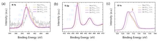 Despite the de-coloration in films, X-ray photoemission spectroscopy (XPS) spectra show distinct features, originating from nitrogen doping (Figure 2a–c). A main peak in the N 1s XPS spectrum for the neat sample was found at around 400.5 eV (Figure 2a), which is known for chemisorbed-N2 molecules on [30,35]. On the other hand, the N 1s XPS spectra for EA- samples can be resolved into two component peaks at around 399 eV and 400.5 eV. The peak at 399 eV is assigned to anionic N− or nitrides in O–Ti–N linkages [27,34,36]. This is further supported by the noticeable binding energy (BE) shifts of Ti 2p XPS spectra. In Figure 2b, BEs of Ti 2p3/2 core level in EA- films are all shifted by 1 eV to the lower energy, compared to that of the neat films. Because the electronegativity of nitrogen is lower than that of oxygen, the local electron density of Ti in the OTi–N bond can be higher than that in the Ti–O bond [26,31]. Thus, the partial electron transfer from N to Ti can cause the BE shift of the Ti2p3/2 core level toward lower energy in EA- samples [27,34]. Further, a noticeable change is found in O1s core level (Figure 2c) when the mole ratio of EA:TTIP increases to 3:1, where a peak centered at around 532 eV in the O1s spectrum is greatly enhanced. Since this peak (532 eV) is often observed if there is oxidized Ti–N, the EA- film prepared with the mole ratio of EA:TTIP = 3:1 contains more Ti–O–N linkages in it. Therefore, it is estimated that the EA- contains O–Ti–N and Ti–O–N (or Ti–N–O) linkages with less positive formal charges of Ti core ions in the structures.