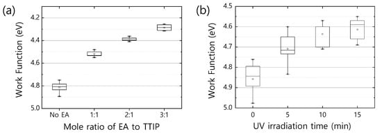 (a) Work function variation as mole ratio of EA to TTIP. Titanium oxide films prepared with higher mole ratio of EA to TTIP exhibit lower work function. (b) Work function variation of a neat film over UV irradiation time. As UV exposure time increases, the work function of the neat film is reduced. In the box plot, the minimum and maximum values are indicated with the asterisk (*), and small square in the box is the average value of each group.