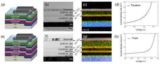 Using neat or EA- as an n-type ICL, we finally fabricated multi-junction solar cells. The tandem solar cell consists of Glass/ITO (80 nm)/PEDOT:PSS (25 nm)/PCDTBT:PC71BM (150 nm)/neat or EA- (10 nm)/PEDOT:PSS (25 nm)/SDTBT:PC71BM (80 nm)/EA- (10 nm)/Al (80 nm) (Figure 4a), and the triple junction solar cell is composed of Glass/ITO (80 nm)/PEDOT:PSS (25 nm)/PCDTBT:PC71BM (150 nm)/EA- (10 nm)/PEDOT:PSS (25 nm)/PCDTBT:PC71BM (150 nm)/EA- (10 nm)/PEDOT:PSS (25 nm)/SDTBT:PC71BM (80 nm)/EA- (10 nm)/Al (80 nm) (Figure 4e). Figure 4b,f shows cross-section images of tandem and triple junction solar cell architectures observed using transmission electron microscopy (TEM). In the TEM (Figure 4b,f) and energy dispersive X-ray (EDX) images (Figure 4c,g), each layer is clearly viewed with no intermixing. Interestingly, when we employed neat as an n-type ICL in a tandem solar cell, the initial VOC only shows the half-cell’s VOC (from the rear cell), and it gradually increases upon UV irradiation and finally reaches the sum of VOCs of subcells after 30-min UV exposure (Figure S6a, see in Supplementary Materials). By contrast, as the mole ratio of EA:TTIP increases for the EA- ICL in tandem solar cells, the VOC is gradually increased and almost reaches the full cell’s VOC already at the mole ratio of EA:TTIP = 3:1 before UV irradiation (Figure S6b,c, see in Supplementary Materials). Using EA- ICL (EA:TTIP = 3:1) and a short UV exposure (less than 1 min), we finally achieved quite high VOCs that match the sum of VOCs of subcells (Figure 4d,h, Figures S6 and S7; and Table S1, see in Supplementary Materials), where the ohmic-like contact may be achieved via Fermi-level alignment between EA- and PEDOT:PSS ICLs of the multijunction solar cells (Figure S8, see in Supplementary Materials). In the tandem solar cell (Figure 4d), the short-circuit current density (JSC) seems to be limited by the front cell’s photocurrent at the short circuit, as shown in the incident photon-to-current efficiency (IPCE) spectrum under the light bias (Figure S7c, see in Supplementary Materials). In the triple junction solar cell, the VOC of the multijunction solar cell shows a great match to the sum of the VOCs of subcells, while JSC exhibits quite a low value (Figure 4h). We suspect that current mismatches between subcells may lead to such a low JSC in the triple junction solar cell, since we used the same photoactive layer of PCDTBT:PC71BM for front and mid subcells. In this study, we only focused on the application of EA- to an ICL as a proof-of-concept. Further control and optimization on multijunction architectures and the combination of photoactive materials may give better performance.