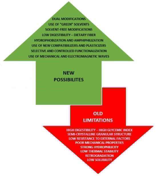 In the presented review, the most important issues regarding starch properties that make this biopolymer so attractive for many industrial applications and thereby multifunctional material have been discussed. Special attention was paid to the limitations in its use, as well as to new approaches and strategies proposed or implemented to solve the main problems related to its processing in recent years (Figure 1). The most promising methods and techniques for its further functionalization, as well as the prospects for the development of starch-based materials in the coming decades, have also been described.