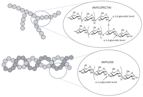 In terms of chemical structure, starch is a polysaccharide. Due to the fact that it consists of only one type of mer, i.e., α-D-glucopyranose, it is classified as a homopolymer. Six-carbon closed rings of glucose units are connected to shorter or longer polysaccharide chains using glycosidic bonds. Such bonds are formed as a result of connecting neighboring molecules through the oxygen atom that forms the hydroxyl group. Chain extension is achieved by replacing the hemiacetal hydroxyl group at carbon C-1 of one glucose molecule with the oxygen atom of the hydroxyl group at carbon C-4 of the next unit, with the release of a water molecule. Therefore, instead of the term glucose unit, the term anhydroglucose unit (AGU) is often used [5]. In this way, one end of the polymer chain, with a free hydroxyl group, is non-reducing, and the other end, with a free aldehyde group, is reducing. In addition to α-1,4-glycosidic bonds, α-1,6-glycosidic bonds also take part in glucose polymerization. While the former are responsible for the creation of chain forms, the latter are responsible for connecting these chains together, resulting in the formation of branched forms. So, basically, starch consists of two polyglucan fractions that differ in structure and, therefore, in properties: linear amylose and branched amylopectin (Figure 2) [6,7]. In amylose, apart from very long polysaccharide chains (average chain length, CL 270–525 AGU), there may be, although definitely few, branches (average CL 5–20 AGU). Amylopectin, in turn, is characterized by many branches but always with short chains [8].