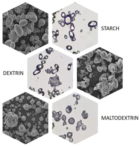Both amylose and amylopectin do not occur in nature as separate compounds but in the form of water-insoluble, discrete, and semi-crystalline aggregates called starch granules. These granules, depending on their botanical origin, differ significantly in morphological terms, especially in terms of size (from 1 to 100 μm) and shape (round, oval, spherical, hull, or irregular) [15]. Changes in the appearance of starch granules also occur in the case of most of its modifications, which is particularly well seen in the example of potato starch and its acidically or enzymatically hydrolyzed derivatives—dextrins and maltodextrins, respectively (Figure 3).