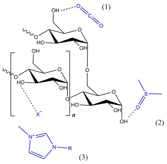 Popular solvents in starch functionalization: (1) scCO2, (2) DMSO, and (3) imidazolium IL.