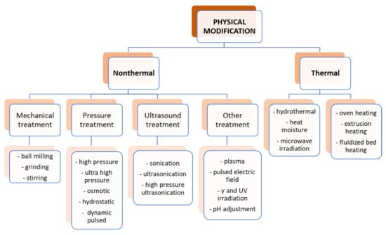 Starch is a polymer compound that is sensitive to a lot of physical factors such as high temperature, very low and high pH, pressure, light, radiation, ultrasonic waves, and various types of mechanical stress. In general, the physical modifications of starch can be divided into two main groups, i.e., thermal and nonthermal, as shown in Figure 5.
