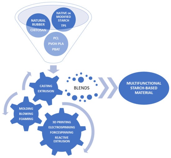 Various methods of preparing blends based on starch or its derivatives are still focused on good compatibility and efficient processing. Such blends have evolved quite dynamically over recent years, from systems with native starch, thermoplastic starch (TPS), or starch modified in various ways to nanostructured varieties. Initially, synthetic, nondegradable polymers were used as blend components. Finally, natural and biodegradable polymers were used. There is an equally wide range of available technologies for their preparation—from typical laboratory or traditional ones such as the solvent casting method, extrusion, molding, and the foaming process to reactive extrusion, 3D printing, or electro- and forcespinning (Figure 6) [54]. A definite trend should be to design materials with improved processing and utility properties while maintaining biodegradability and the nature of environmentally friendly materials.