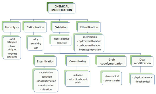 Based on the number of studies conducted in recent years, it seems obvious that of all the methods used in starch processing, typical chemical methods are the most important due to the scope of application (Figure 7) [69,70]. The most commonly used chemical functionalization of starch is based on classic organic chemistry reactions such as crosslinking, grafting, esterification, etherification, hydrolysis, or oxidation (Figure 8).