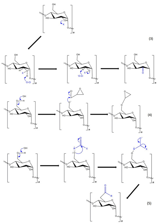 All these reactions lead to starch derivatives, whose physicochemical properties differ substantially from those of the starting material [71]. Due to its chemical structure, starch has characteristics typical of aldehydes, ethers, and especially alcohols. The ether bond (C-O-C) occurring in the glucopyranose ring of starch is quite stable and not very reactive. It is only susceptible to acid or base hydrolysis at elevated temperatures. The situation is similar with glycosidic bonds responsible for the formation of chains and branches in this polysaccharide. They undergo hydrolysis in the presence of hydrogen ions through the action of strong acid and increased temperature (uncontrolled method)—and hydrolases during enzymatic decomposition (controlled method). The unbranched fraction, i.e., amylose, is more susceptible to hydrolysis. In turn, the glycosidic bonds of both fractions are stable in an alkaline environment, even at elevated temperatures [72]. Therefore, the most susceptible to chemical interactions seem to be hydroxyl groups, of which starch has many, up to three free groups per AGU. These are primary groups at carbon C-6, the most reactive groups, and secondary groups at carbons C-2 and C-3. However, the reactivity of native starch is low due not only to the polymer structure but also to the multi-stage organization of starch granules. Accessibility to hydroxyl groups and glycosidic bonds is hampered by the presence of a dense network of intra- and intermolecular hydrogen bonds [5]. Thus, starch reactions are determined not only by the reactivity of its functional groups and reagents. These are usually reactions at the phase boundary, which, given the complex structure of starch, prevents the effective penetration of the reagent into the potential reaction site. This explains the fact that the degree of starch conversion is usually not great, and a number of functional groups of glucose units remain intact. In turn, those functional groups that are available to the reagents do not always react selectively because local disturbances in the reagent concentration occur. Hence, there is a need not only to develop methods of loosening the starch structure and increasing the potential reaction sites but also to develop selective modifications. Therefore, an effective solution seems to be to conduct regioselective reactions based on one of three approaches: the use of protecting groups, regioselective replacement of -OH groups with other functional groups, or catalyzed selective functionalization of these groups without the use of a protecting group [73,74]. The selective functionalization of starch is discussed later based on the examples of starch oxidation.