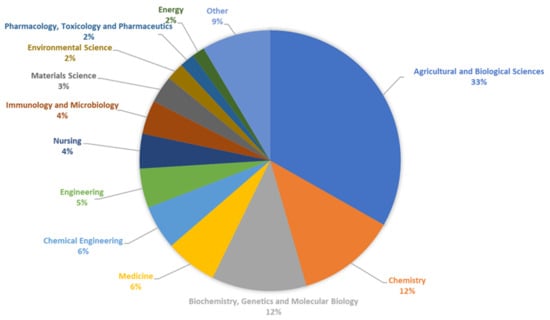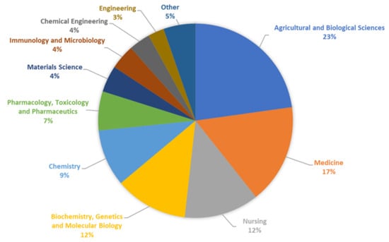 In recent years, we have observed an increase in the number of publications and a constantly high number of patents devoted to resistant starch. The percentages of documents by subject area on resistant starches published over the last 10 years are presented in Figure 9.