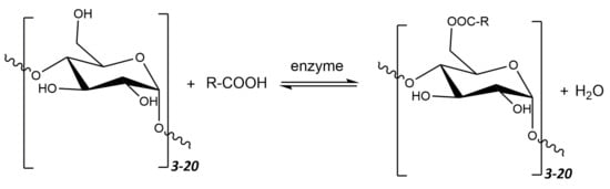 As a result of esterification, products can be obtained with properties depending on the type of acid used, the glucose equivalent of maltodextrin, and the degree of substitution of the finished product. Additionally, the use of enzymes as esterification catalysts offers an attractive alternative to the synthesis of oligo- and polysaccharide esters. Such reactions can be carried out under milder conditions (lower temperature and pressure), which prevents the depolymerization of polysaccharides [212]. Enzymatic catalysis reduces the need to use toxic reagents (mainly solvents) and can also be carried out under milder pH conditions. These types of reactions are safer for health and may be of interest for biomedical and food applications (emulsifiers, stabilizers, targeted food) [213].