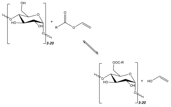 Udomrati and Gohtani [207] esterified tapioca maltodextrin (DE = 16) with free fatty acids (decanoic, lauric, and palmitic) in the presence of immobilized lipase from Thermomyces lanuginosus in a DMSO environment and with a molar ratio (D-glucose acid/fatty acid) equal to 1:0.1, 1:0.5, and 1:1. In the reaction, they used temperatures in the range of 50–70 °C and incubation times from 2 to 8 h. The obtained products showed a DS of 0.002–0.084 and a solubility in the range of 84.8–87.2%. The highest DS results were obtained for the molar ratio of 1:0.5, at a temperature of 60 °C and after 4 h of the reaction. Studies have also shown that the chain length used in the esterification of the fatty acid affects the degree of substitution obtained during the reaction. This is due to the limited mobility of the longer-chain acids in the reaction system, which in this case leads to compounds with a lower degree of substitution.