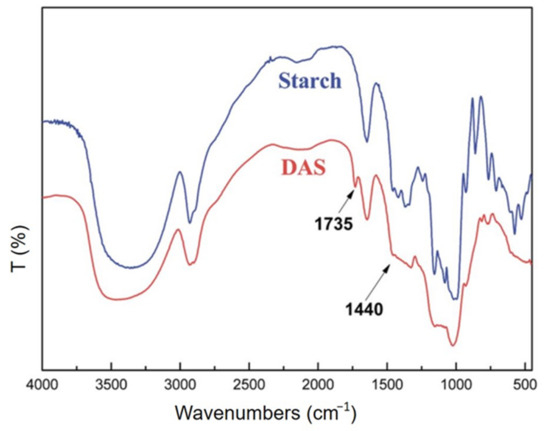 - Zuo, Y.; Liu, W.; Xiao, J.; Zhao, X.; Zhu, Y.; Wu, Y. Preparation and characterization of dialdehyde starch by one-step acid hydrolysis and oxidation. Int. J. Biol. Macromol. 2017, 103, 1257–1264. [Google Scholar] [CrossRef] [PubMed]