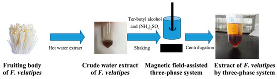The fruiting body of F. velutipes was washed, dried, crushed and sieved at 100 mesh. The powder of the F. velutipes was suspended in 500 mL of 95% ethanol and extracted for 1 h with an SB25-12D ultrasonic generator (Ningbo Scientz Biotechnology Co., Ltd. (Ningbo, China))at a 40 kHz frequency three times and hot water extraction three times, each time for 2 h. Certain amounts of solid ammonium sulfate (mass fraction 10–60%) and tert-butyl alcohol (5–30 mL) were added to the water extract at room temperature. The extraction tube was placed under a magnetic field, stirred at a certain rotation speed of 100 rpm for 30 min and then used to form three clear phases at 2500 rpm for 5 min. The lower aqueous phase was dialyzed, concentrated and dried to obtain purified extracted F. velutipes polysaccharides (Figure 1).