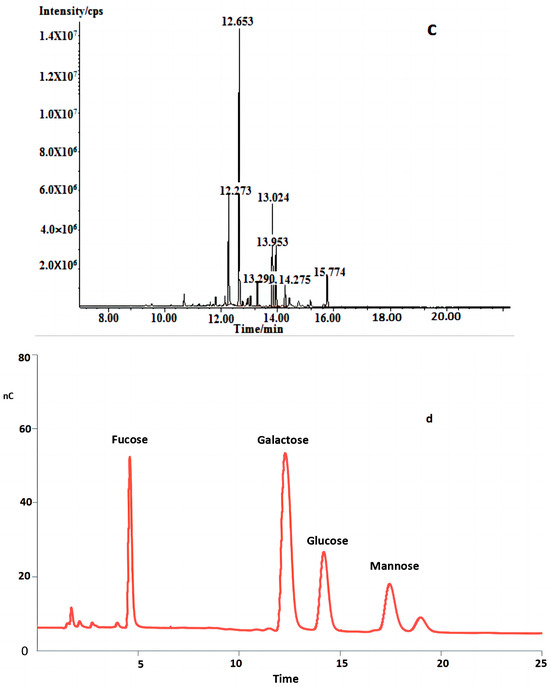 In Table 1 and Figure 2c,d, the GC-MS data indicate that the FVPT1 had a branched structure, including mannopyranose residue and glucopyranose residue, at the terminals; a main chain structure including 1,2-di-substituted fucose, 1,4,6-tri-substituted galactose, 1,3,6-tri-substituted galactose, 1,2-di-substituted fucose, 1,4-di-substituted galactose and 1,3-di-substituted glucose; and a fucose residue at the other terminal.