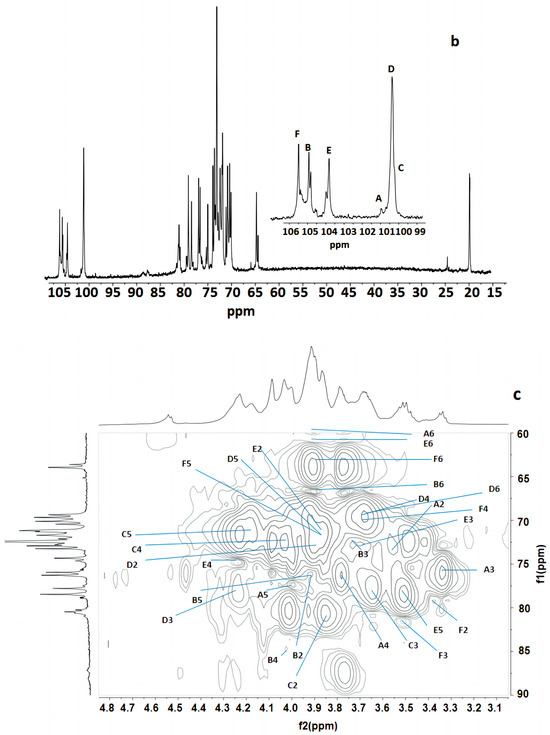 NMR of FVPT1 in deuterium oxide (D2O) at 27 °C. (a) The 600 MHz 1H NMR spectrum of FVPT1. The anomeric protons are labeled as (A)–(F). (b) The 150 MHz 13C NMR spectrum of the FVPT1 polysaccharide in D2O at 27 °C. (c) HMQC of the FVPT1 polysaccharide in D2O at 27 °C.