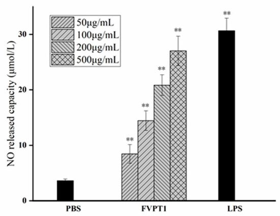 The enhancement of FVPT1 in NO release. The Raw264.7 cells were treated with FVPT1 (50, 100, 200 and 500 μg/mL) or 10 μg/mL of LPS for 48 h. ** p < 0.01 vs. the PBS group.