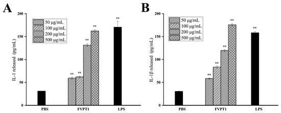 The promotion effects of FVPT1 on the cytokines released by RAW264.7. (A) Detection of IL-1 secretion with ELISA assay. (B) Detection of IL-1β with ELISA assay. ** p < 0.01 vs. the PBS group.