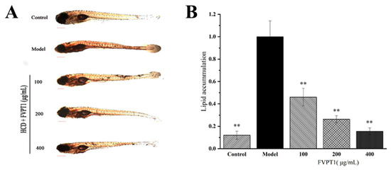 The lipid-decreasing effect of FVPT1 in vivo. (A) Representative photos of the whole-body stable lipid appearance of zebrafish larvae treated with FVPT1 at different concentrations (100, 200 and 400 μg/mL). (B) Lipid content was normalized to IOD data through blood vessels. ** p < 0.01 vs. the model group.