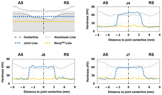 The analysis of the microhardness profile was performed in joints J4, J6, and J7 since they exhibited the maximum, intermediate, and lowest mechanical strengths, respectively. Given that we are analyzing a metal–polymer composite joint, the measurements were taken in three different regions: (i) the aluminum line, (ii) the joint line, and (iii) the NorylTM line, as schematized in Figure 5. The hardness of the base materials was previously assessed to define the baseline values for the analysis. This way, the hardness values were found to be 102 HV1 and 18 HV0.2 when testing the aluminum and NorylTM plates, respectively.