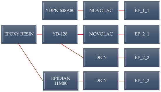 - The lowest coefficient of thermal expansion was recorded for composite materials where epoxy resin based on bisphenol A is used but cured with different catalysts, dicyandiamide, and novolac. The coefficients of thermal expansion are 4.7118 and 4.8752 [10−5/°C], respectively.
