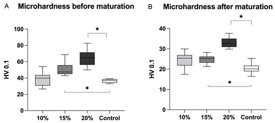 Microhardness quantification was performed promptly after sample preparation (A) and following a 30-day maturation period (B). The GIC fortified with 20% of glass fibres demonstrated the highest hardness among the tested groups, exhibiting a statistical significance (p < 0.001). Mean values were expressed together with maximal and minimal obtained values. Asterisk (∗) indicates level of statistical significance p ≤ 0.05.