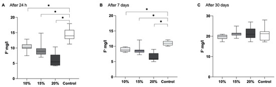 A similar trend in fluoride release was evident after 7 days, with a noteworthy distinction observed between the control group and the experimental groups at this temporal point (p < 0.01). At this time point, the following values were obtained: 8.85 ± 0.69 for the 10% group; 8.77 ± 1.43 for the 15% group; 6.49 ± 1.36 for the 20% group and 11.03 ± 0.72 for the control.