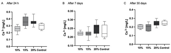 A quantifiable release of calcium ions was observed consistently across all groups at 24 h, 7 days and 30 days (Figure 3). However, there were no statistical differences observed among groups (p > 0.05).