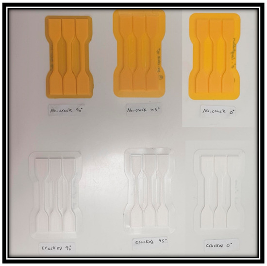 In this specific study, the 3D-printed specimens were produced with a solid composition, utilizing a linear infill pattern set at 100% density. The decision to maintain uniformity in infill pattern and density was intentional, as the study primary goal was not to explore the effects of different infill patterns or densities on failure performance. Instead, the primary focus was directed toward evaluating the significance of differences between specimens before and after flaws were introduced, as well as assessing the potential consequences on the overall structural integrity of the specimens stemming from the adoption of varying raster angles. The samples experienced slow-speed testing at a rate of 1 mm/min using a uniaxial tensile testing rig. To distinguish the samples according to their manufacturing processes, specific identification methods were implemented. The samples were then classified into the following categories: