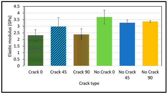 Empirical analysis has revealed a noteworthy discrepancy in the elastic modulus between a sample devoid of cracks, oriented at a 45-degree angle, and a reference specimen. Specifically, the elastic modulus of the crack-free 45-degree microstructure measures at 3.26 GPa, a modest 0.3% higher than the established reference value of 3.25 GPa as shown in Figure 5.