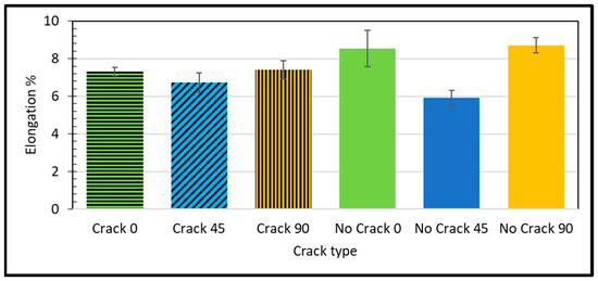 - In the experimental tensile test, we observed that the highest values for elastic modulus, ultimate strength, and elongation were recorded for the “No Crack 0” configuration. Conversely, the lowest values for elastic modulus, ultimate strength, and elongation were observed for the “No Crack 0”, “Crack 90”, and “No Crack 45” configurations, respectively.