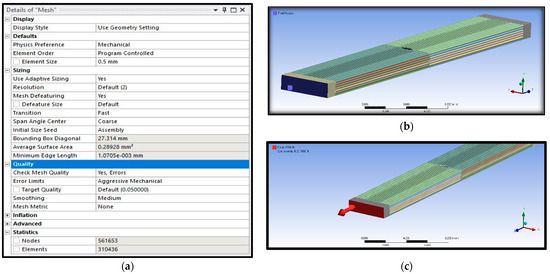 (a) Mesh details, (b) fixed support, and (c) force applied.