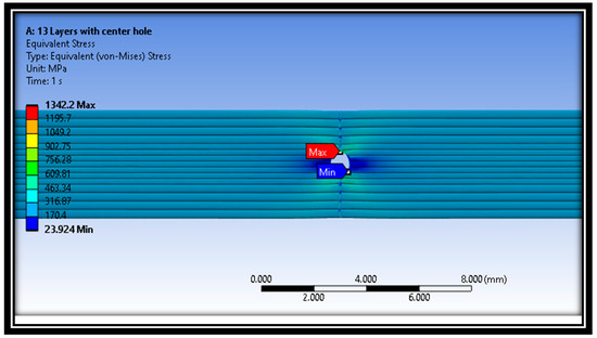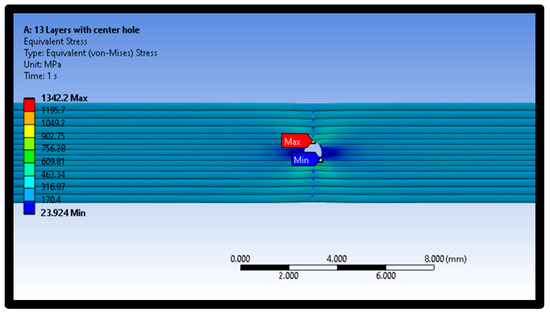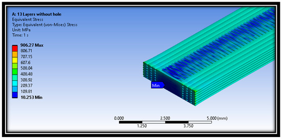 In addition, the distribution of Von Mises stresses for the intact sample at a raster angle of 90° for layer 13 is also shown in Figure 14. The minimum stress was examined at the middle layer 13 of the material sample. The maximum and minimum Von Mises stresses values are 906.27 MPa and 10.253 MPa, respectively. On the other hand, the distribution of Von Mises stresses for defective samples at a raster angle of 0° is also shown in Figure 16. The results show that maximum and minimum stress values are at the material samples’ central portion.